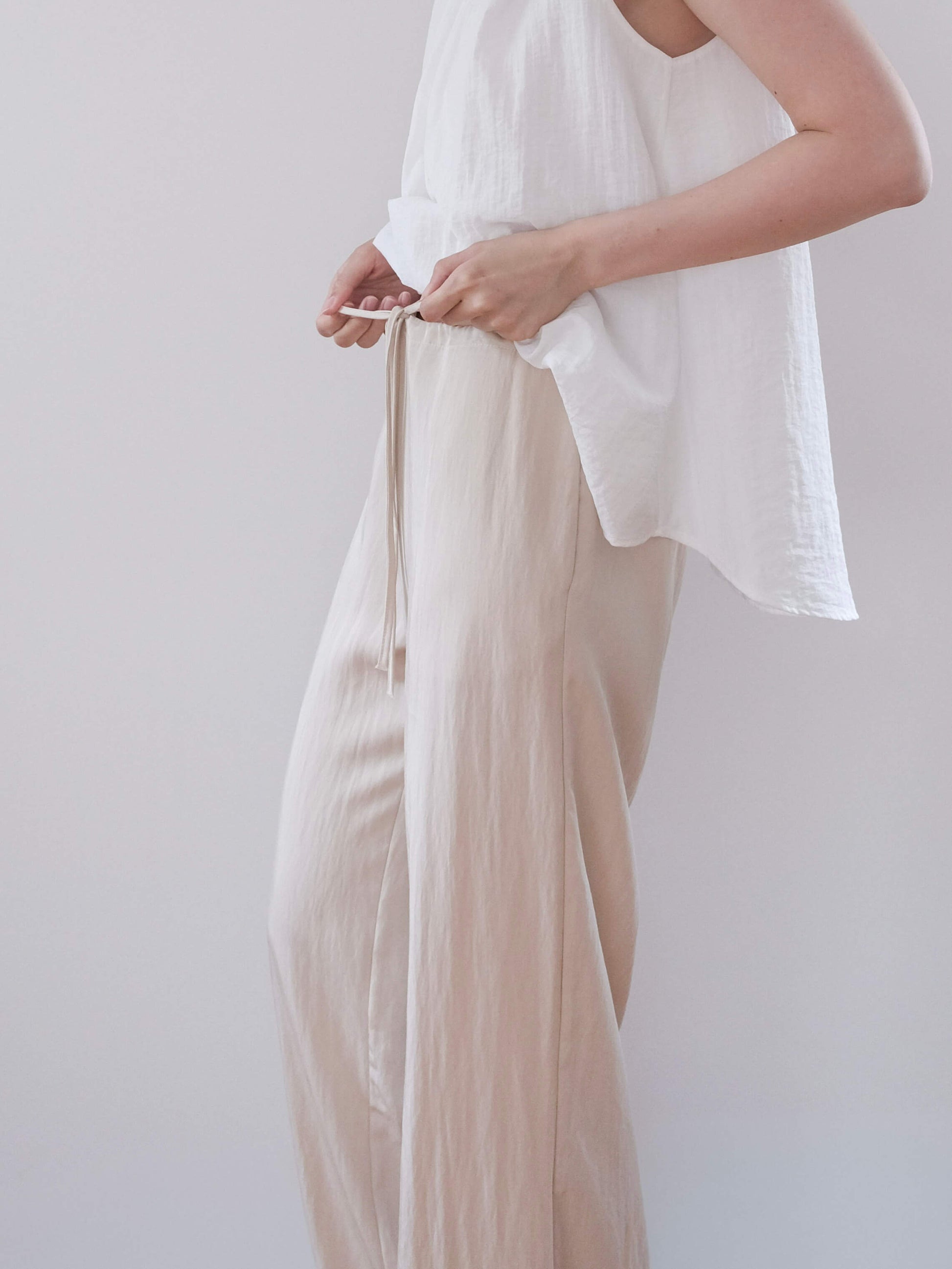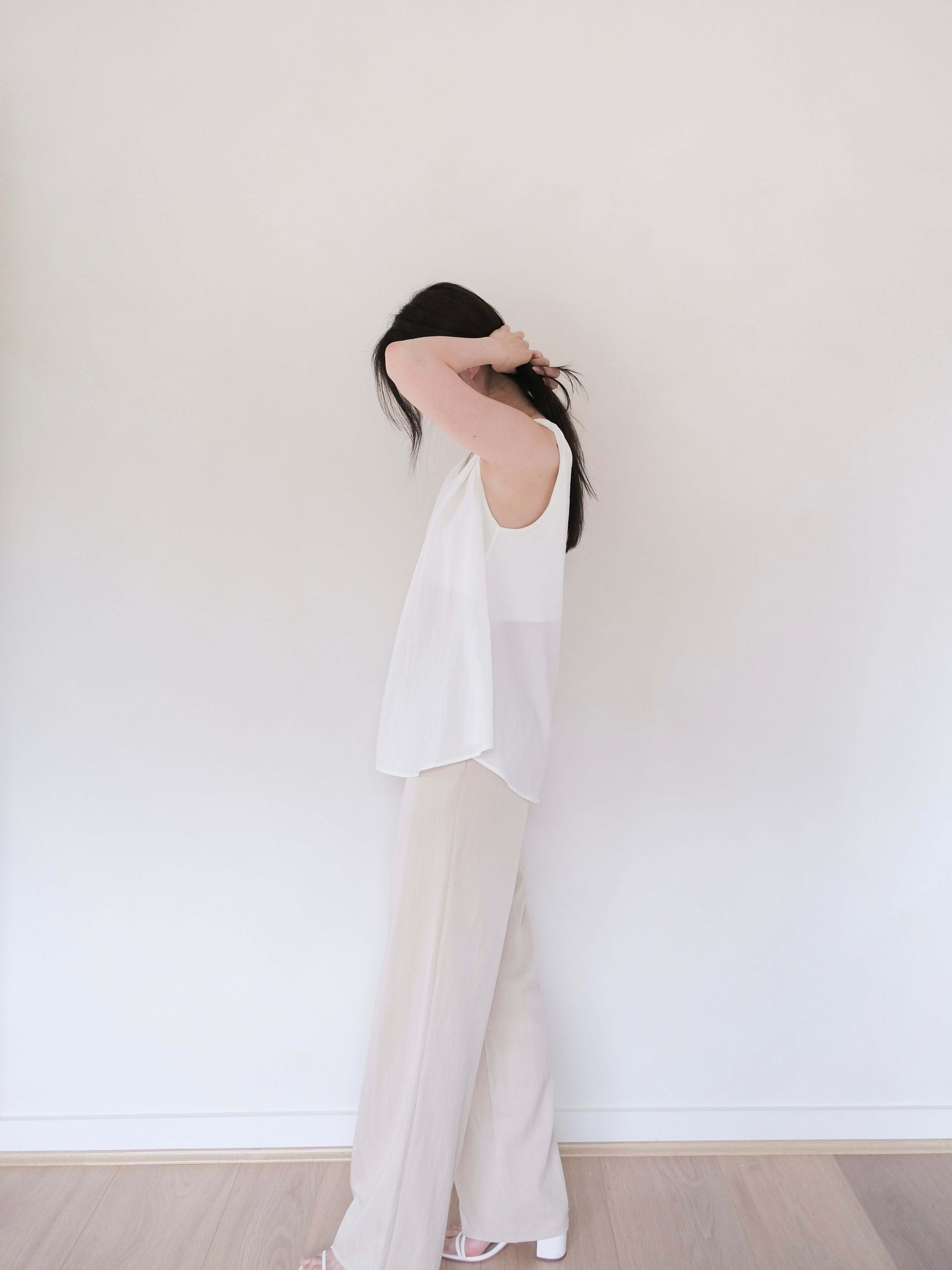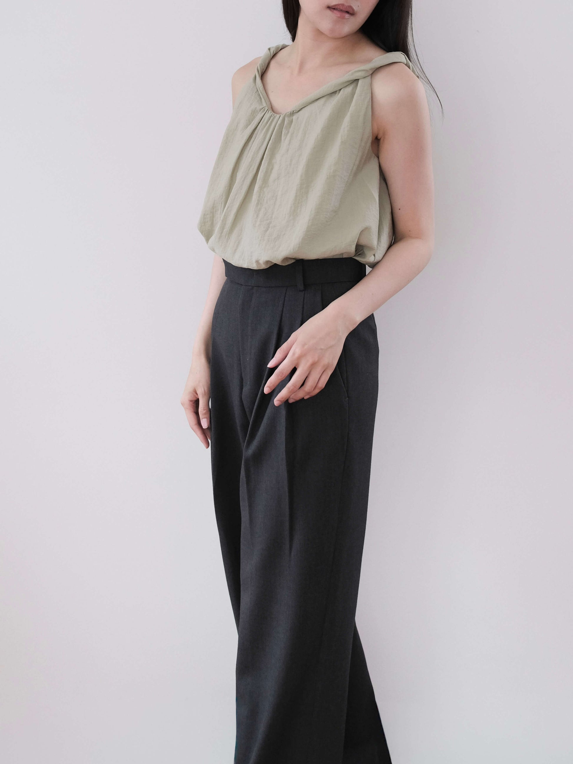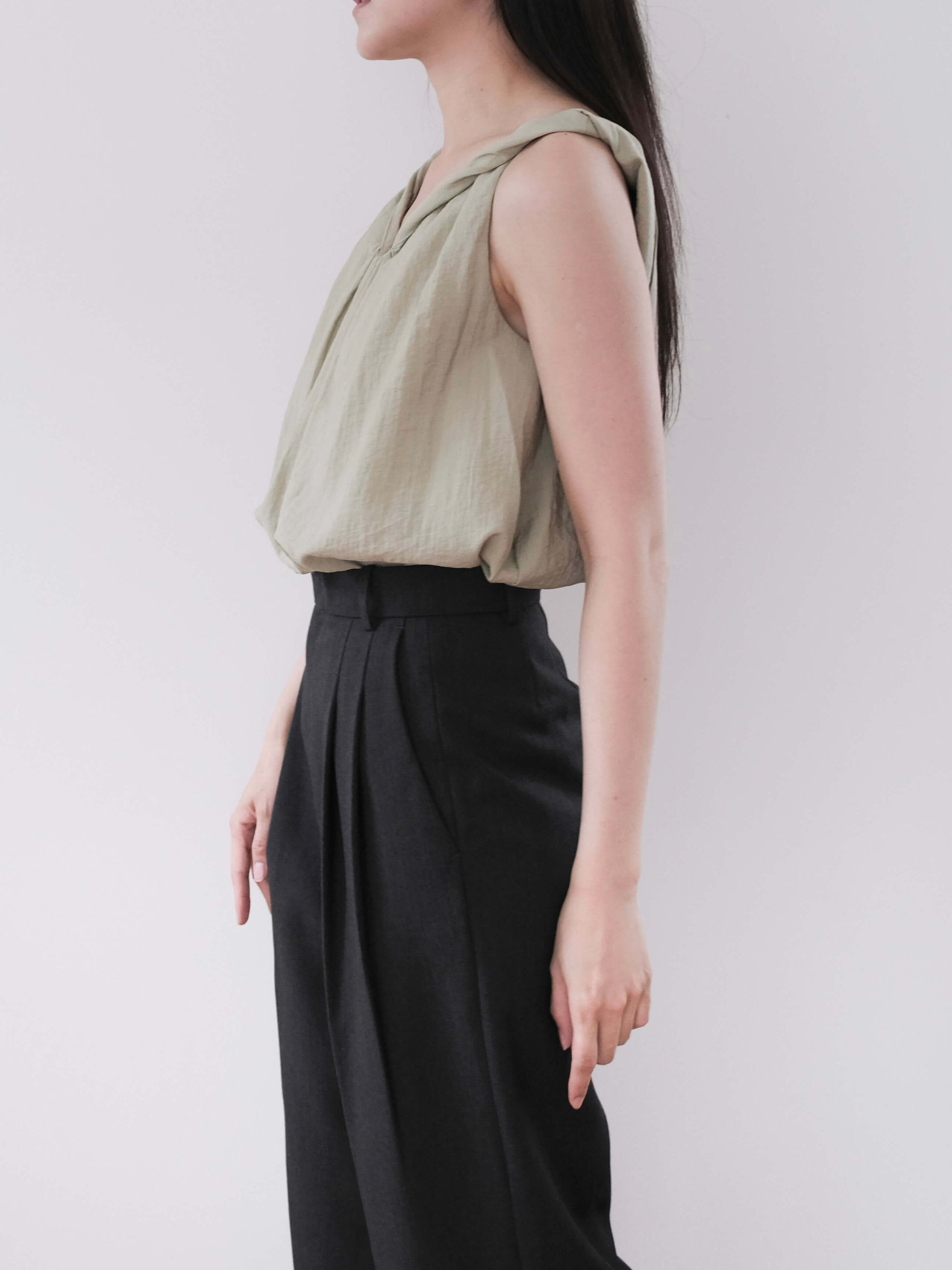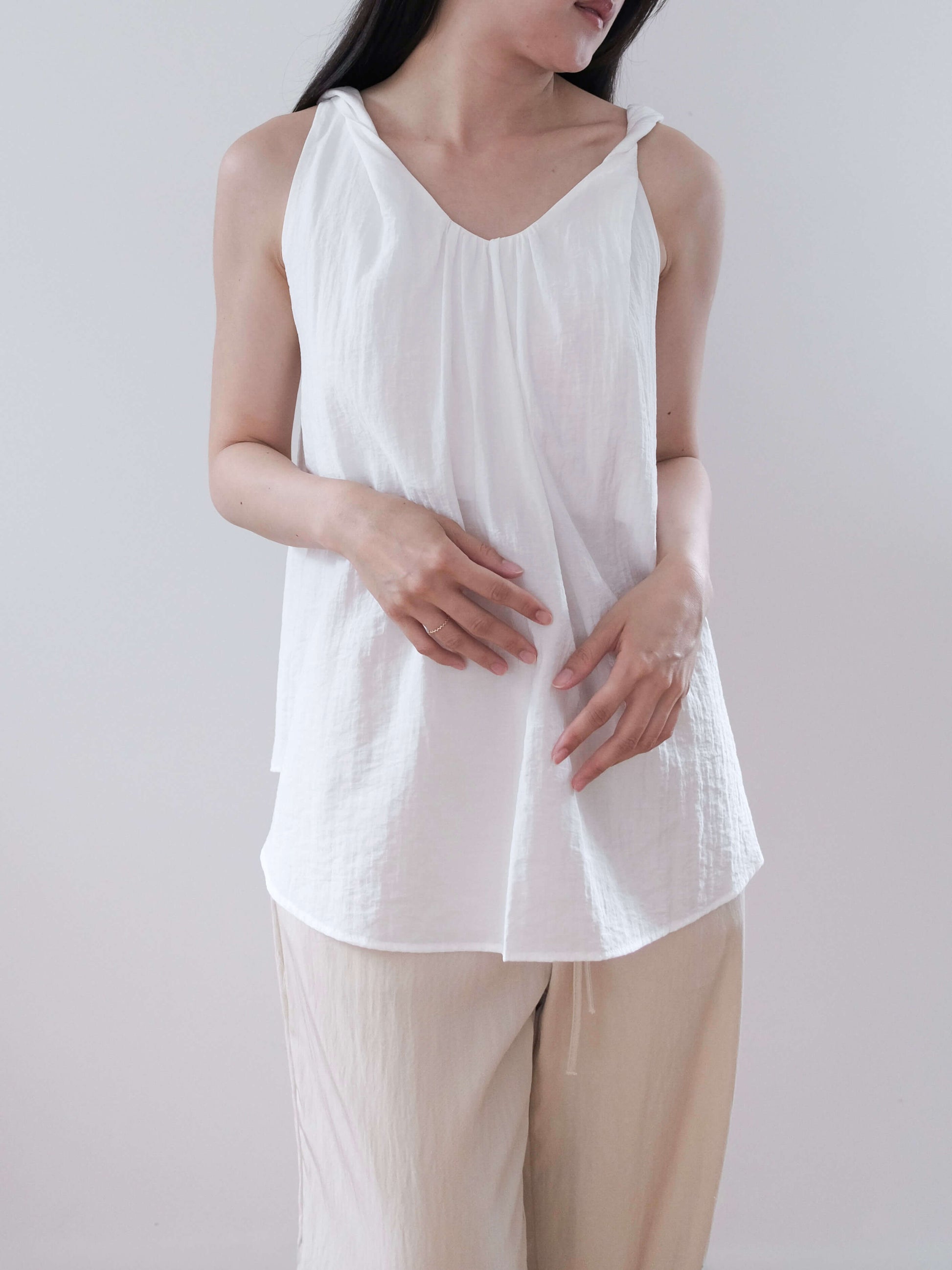 a lightweight top with a subtle twist detail at the neckline that highlights the collarbone.